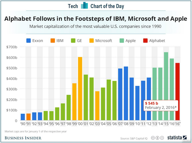 Have a look at which companies have been the most valuable over the last 25 years. It is interesting to see how it took Apple 15 years to surpass the high water mark set by Microsoft in 2000. Also note how the company values have been rising thanks to inflation but also thanks to huge population growth and the growth in global income levels - Here are the most valuable companies in America since 1990