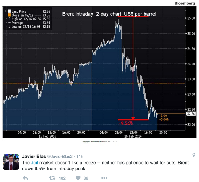 "We all knew that Russia and Saudi Arabia were meeting, the market I thought was expecting some production cuts from OPEC and the majors. It seems that the truth is that the budgets of all the oil producers rely heavily on the volumes being as high as possible. Saudi and Russia (and many other producers, Venezuela and Nigeria spring to mind) have had serious budget problems recently. So volumes almost have to remain high."