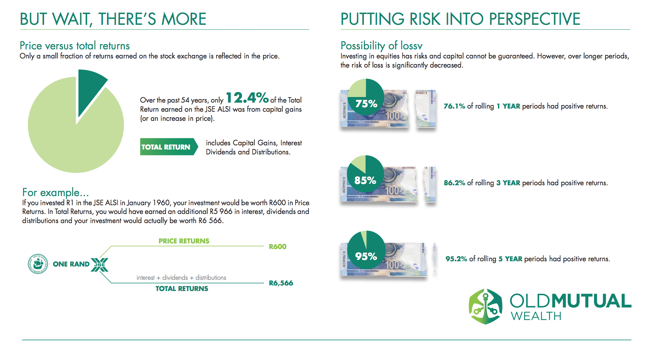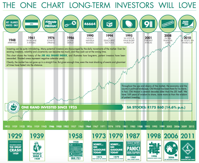 And then an Old Mutual graph below went with another answer to concerns about the equities market. I think that it is pretty self explanatory and it takes all the events, global and local and puts in the returns over that time, of the overall market.