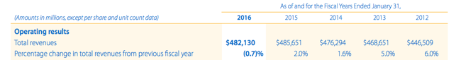 It is a steady business that delivers year in and year out, people shop there for value. And there are always people looking for value. So ..... when the Walmart share price fell from nearly 90 Dollars a share in January of 2015 to 56 Dollars by November, down 35 percent for the year, did that mean that Walmart sold less, reported lower profits? No. Share price performance and actual reported numbers have a close correlation, they are not one and the same. In fact, when the share price was 35 percent lower, sales reported are not that different from the years prior.