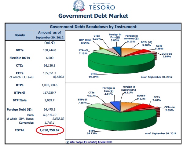I thought to myself, what is the extent of the outstanding debt in Italy? They have been going sideways from an economy point of view for years, but their debt has actually been piling up. Check out this graphic that I found via the Italian Treasury website > Government Debt Market. This is total debt outstanding, a whopping 1.65 trillion Euros:
