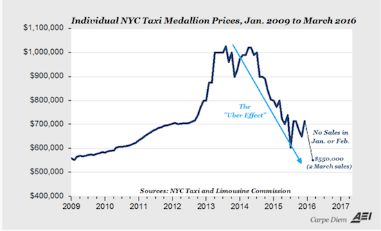Uber has been a major disrupter in the taxi industry, the effect can be clearly seen on the medallion cost for the right to operate a taxi on the streets of NYC - Uber Effect
