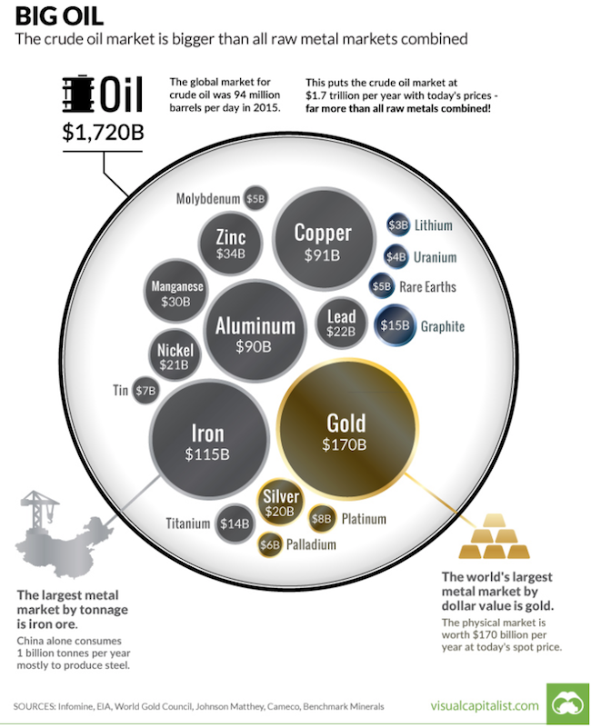 We all know how important oil is to our daily lives. I didn't realise how big the oil industry was though - The Oil Market is Bigger Than All Metal Markets Combined.